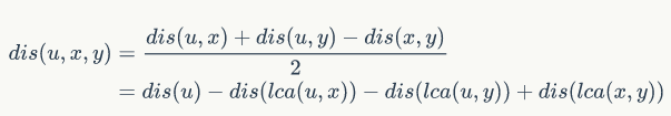 //dis(u)+dis(x)-2dis(lca(u,x)) + dis(u)+dis(y)-2dis(lca(u,y))